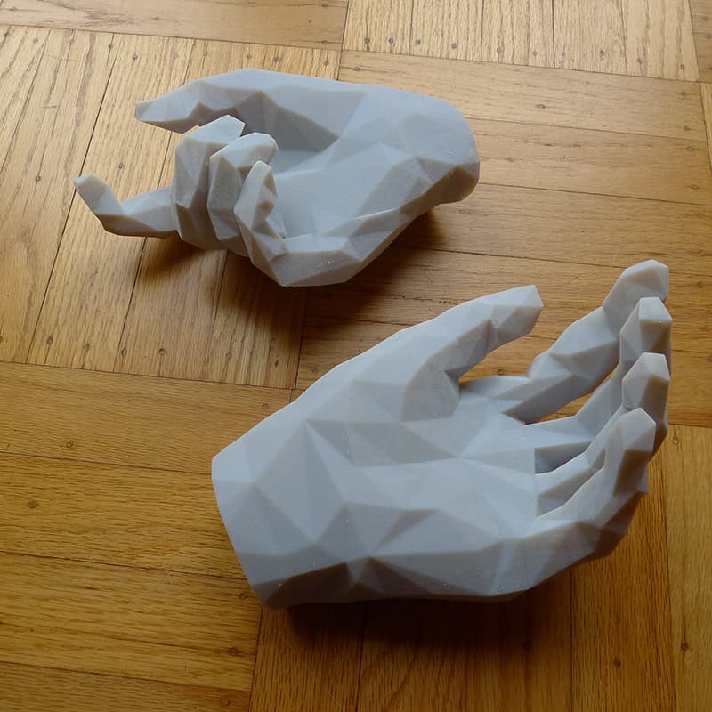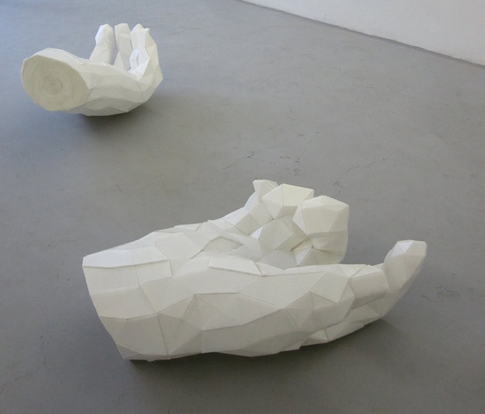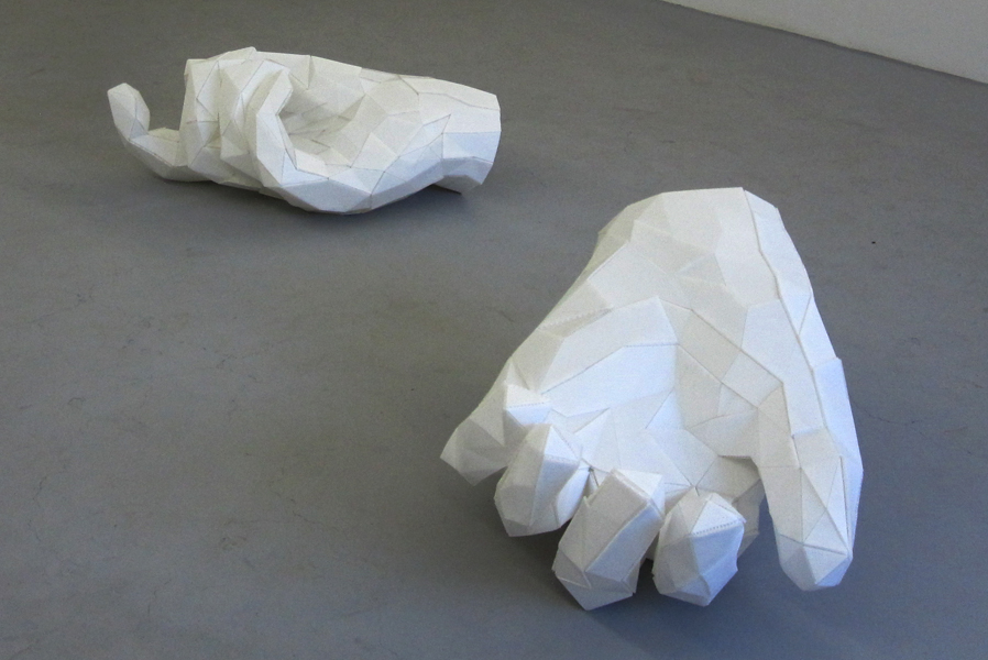 “The hands of a Taliban fighter, as depicted in the controversial Medal of Honor (Electronic Arts) shooter game. These sculptures were created through a complex process of 3D data extraction from the game for physical construction adapting Pepakura Designer for use with white corrugated plastic. These pieces were created while on residency in China in 2011 for a show at the Where Where Exhibition Space, Beijing.” –Joseph DeLappe