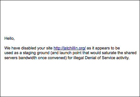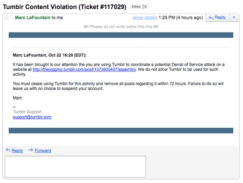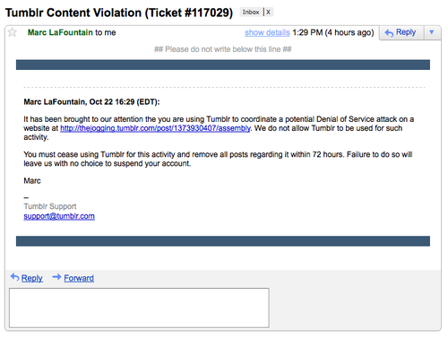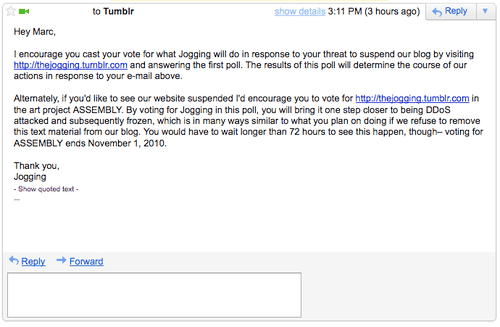 After JstChillin.org was deleted by their server yesterday for hosting ASSEMBLY, the project was moved to http://thejogging.tumblr.com Friday October 22, 2010. That day, an e-mail was sent to Jogging by Tumblr Community Director Marc LaFountain. It said the following: