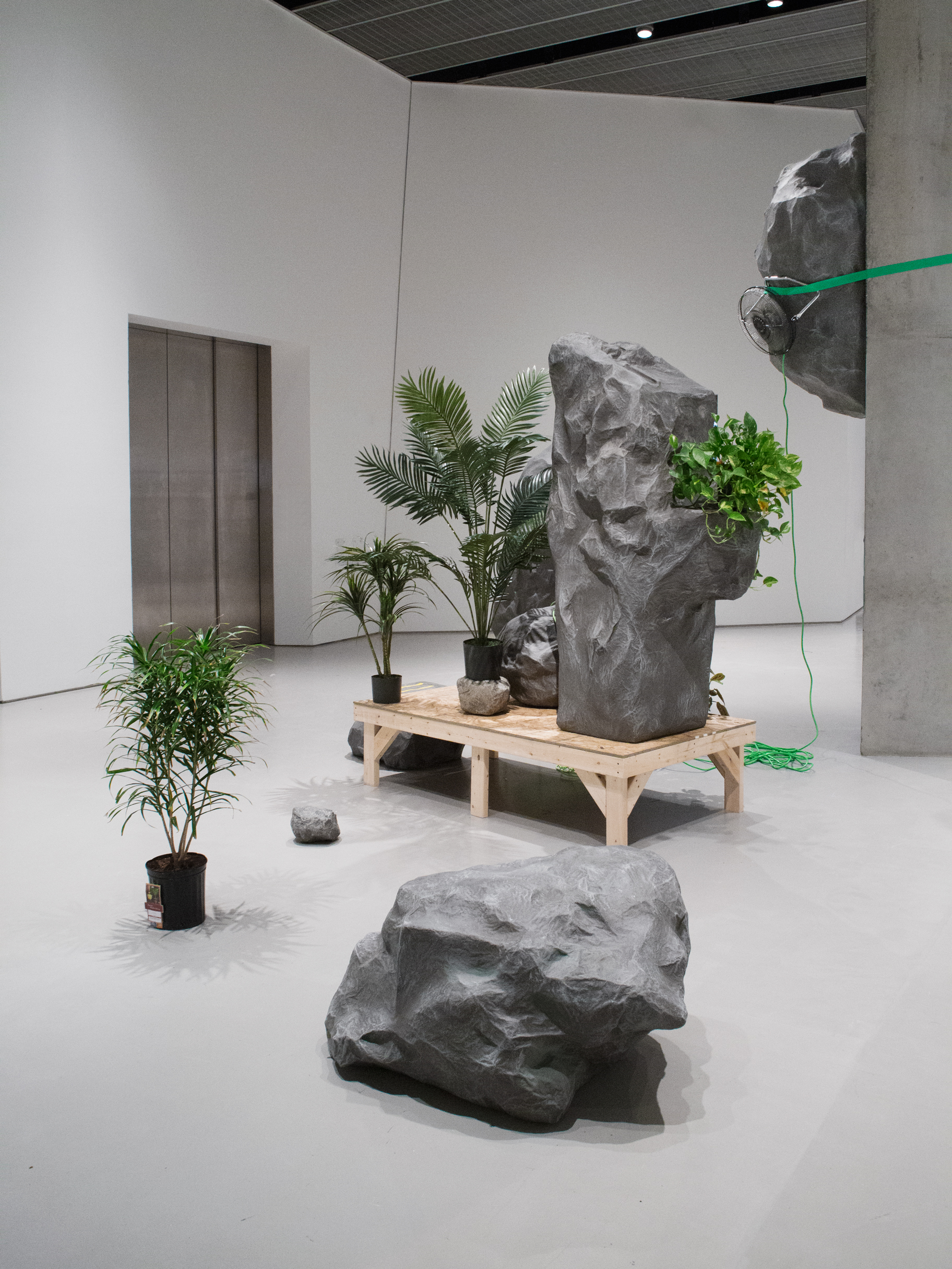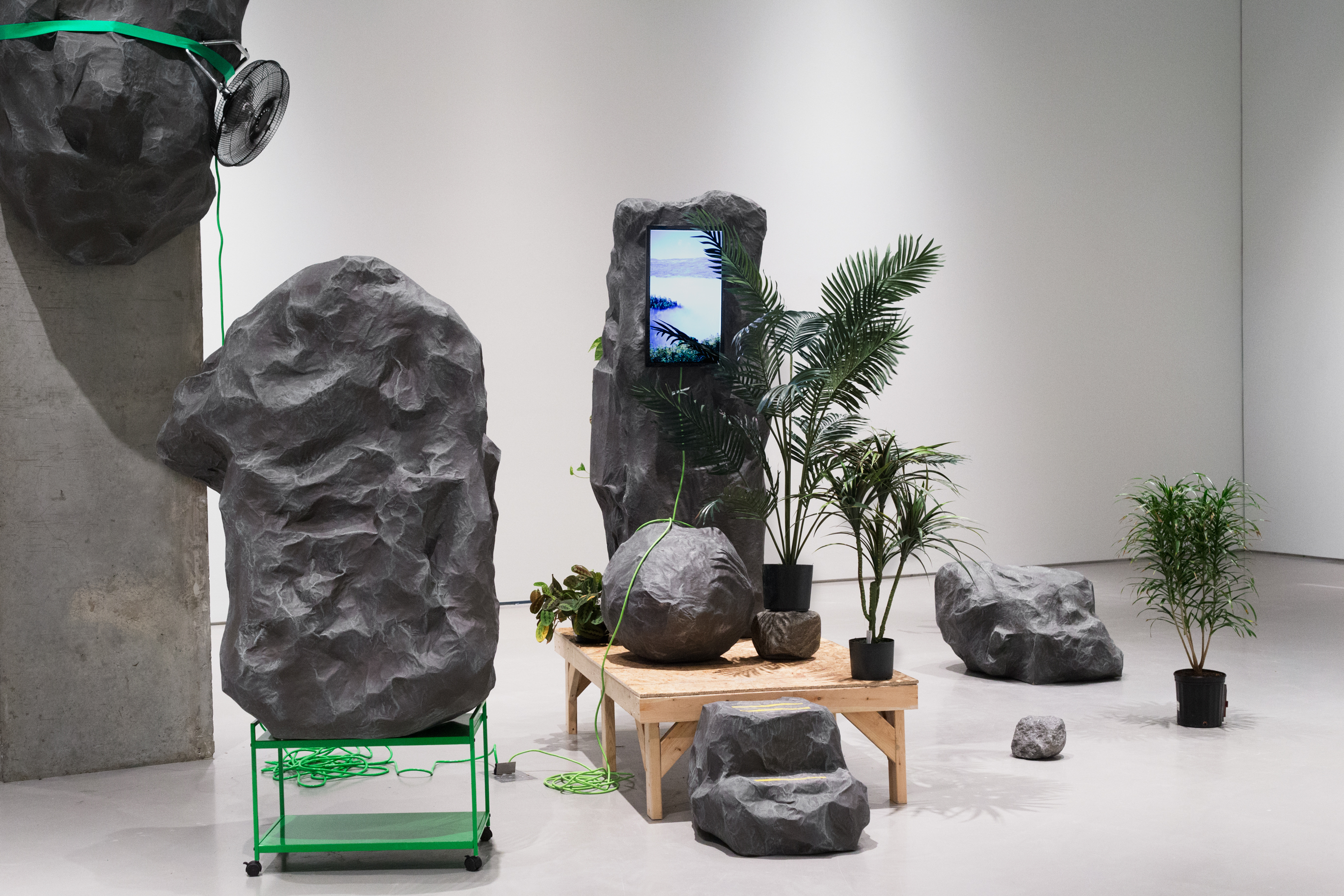 “Summit is an amalgamation of Romantic landscape paintings, miniature golf courses, and Google image searches. In Summit, sculptural interventions work to create an immersive experience addressing the nature and function of photography in contemporary visual culture.