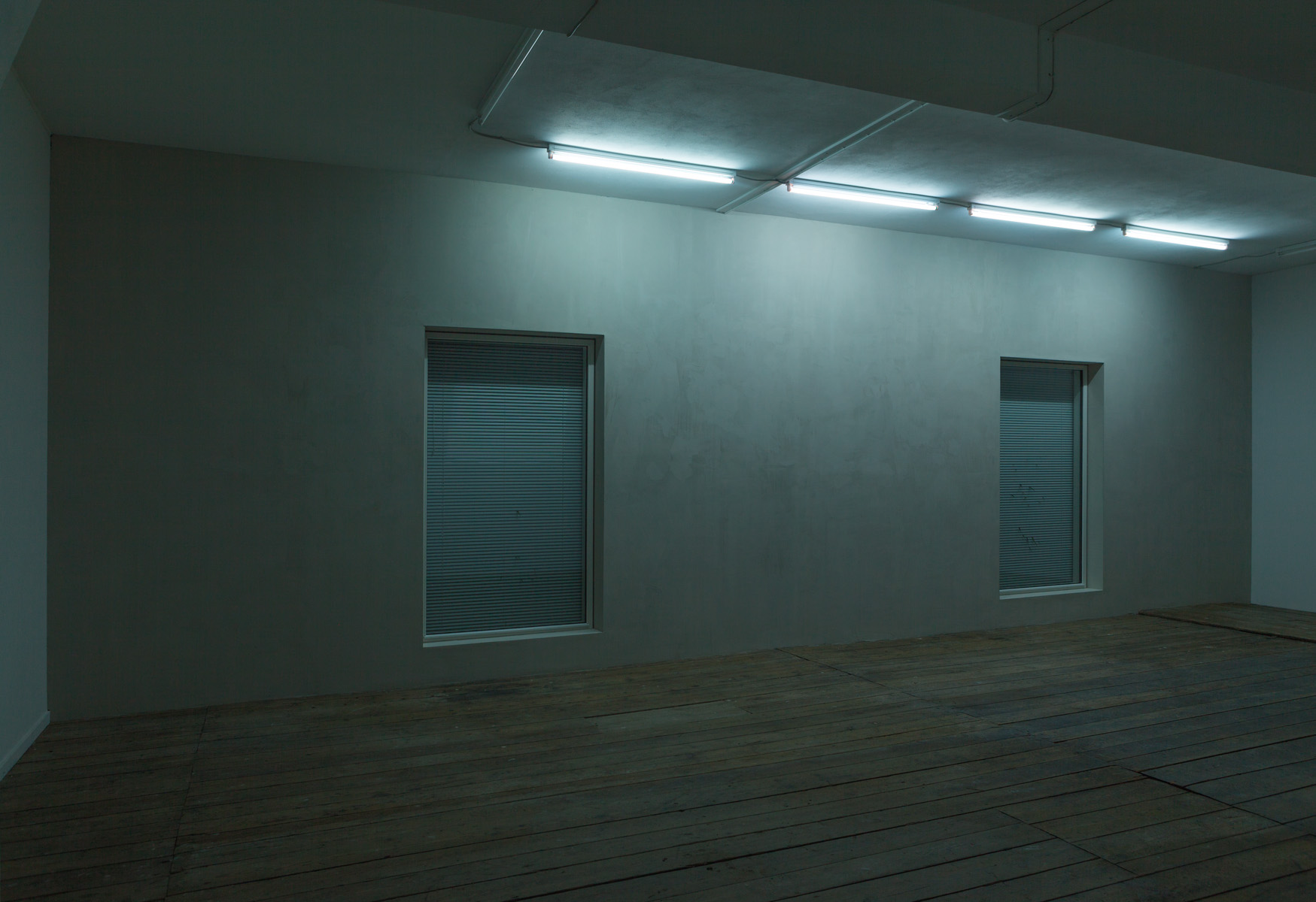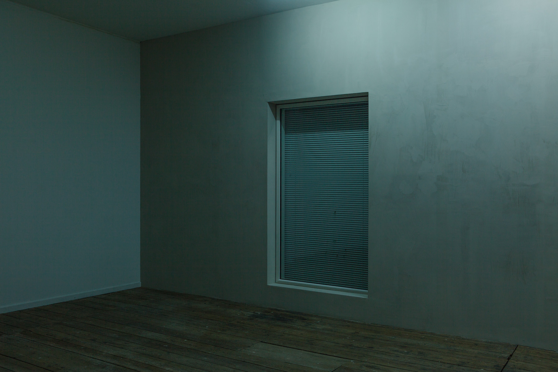 Two windows with closed blinds are inserted in the wall that divides the exhibition space. Plant parts are trying to work their way through the blinds which moves slightly but not enough to reveal what is on the other side.