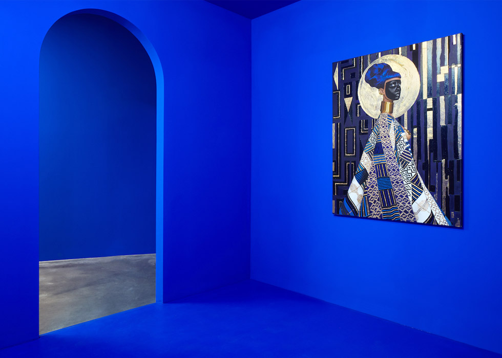 “…The second gallery is painted in deep ultramarine blue, emulating the ‘Blue Room’ in the artist’s studio. A meditative space is built within the gallery featuring Syzygy, Viktor’s first figurative canvas reflecting the aesthetic vernacular the artist has developed over the past four years. Also on view are three works from A Haven. A Hell. A Dream Deferred. These works reinterpret the Libyan Sybil, a prophetess from antiquity invoked by eighteenth-century abolitionists as a mythical oracle who foresaw the trans-Atlantic slave trade.