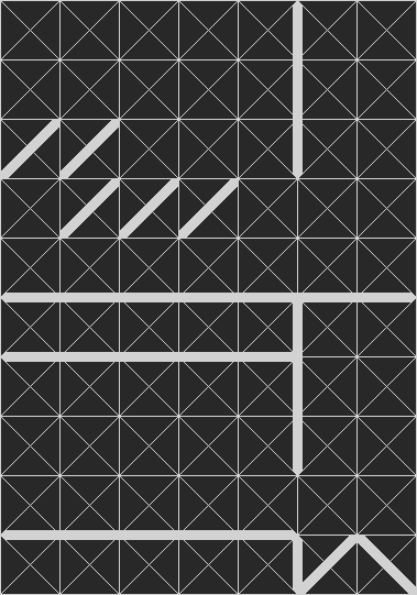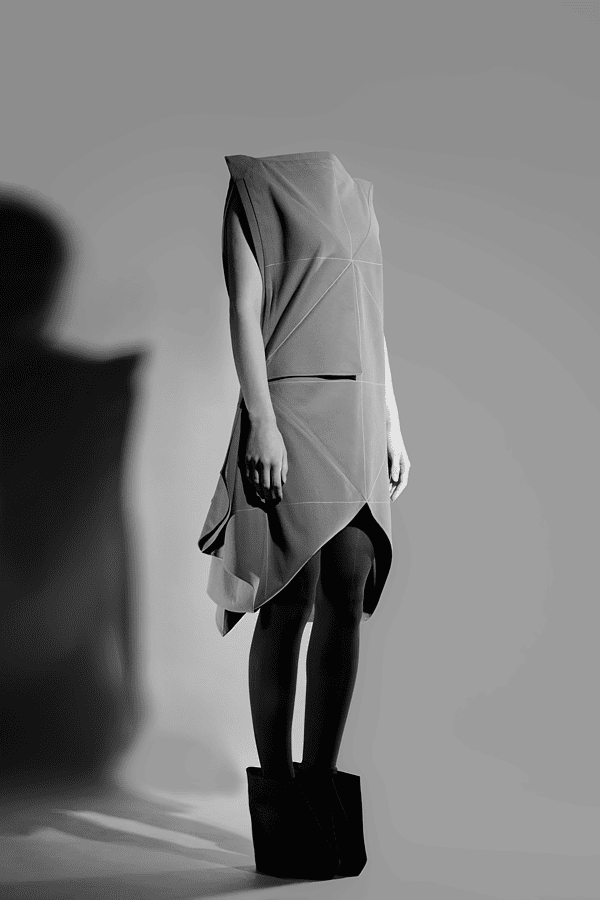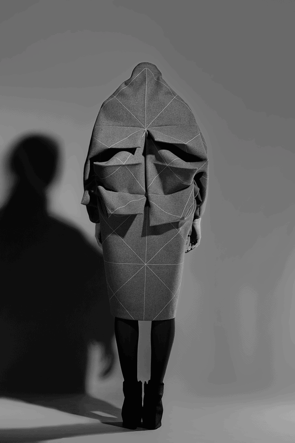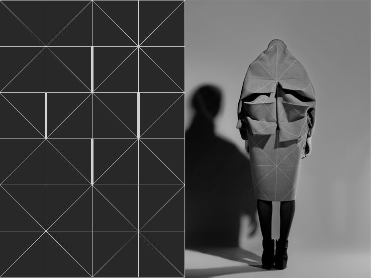 Models of the collection represent a variety of matter levels in the universe. All pieces’ patterns are composed of the one repeating basic element – the square divided by diagonals – an elementary particle, but each model has a different scale and number of particles involved.” – Lisa Shahno.