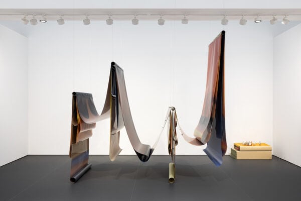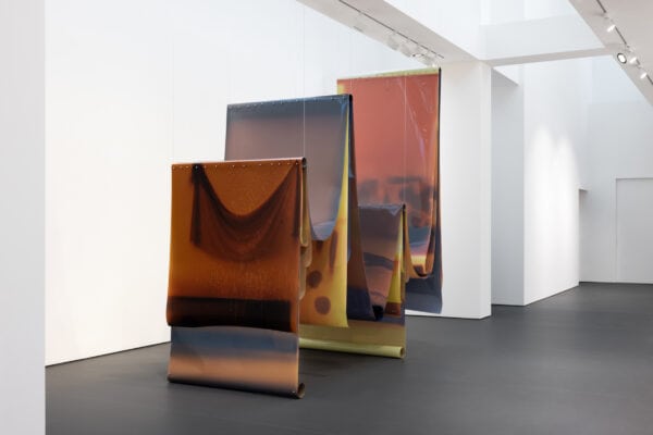 “Lengths of unfixed industrial film, ‘skins’ as Kang refers to them, are draped over and across raw steel tubes suspended from the ceiling. The shadowy impressions on the film create layered, visceral timescales, rendered in a palette of yellow, orange, red, purple and brown. By intentionally misusing the material, exposing it to sunlight and manipulating its exposure in both planned and unforeseen ways, the artist has invented modes of inscribing her process, turning the film into indexes of overlapping durations. The film is ‘tanned’ across multiple sites: her studio, her home, and predominantly, in a greenhouse situated in upstate New York.” – Esther Schipper