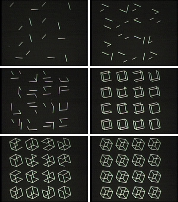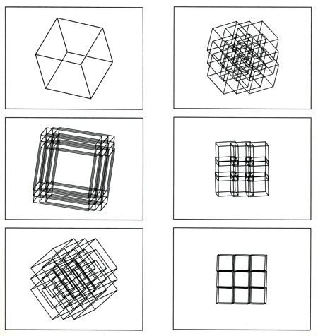 If an artist has a muse or source of inspiration for their work, perhaps it would be best to call Mohr’s the cube. By using the computer’s ability to algorithmically generate a continuous stream of figures he is able to explore spaces that exceed human intellect. The cube as a deceptively minimalist element in fact posses unlimited potential for algorithmic complexity. For Mohr it is a “fixed system which signs are generated.” In Cubic Limit II he simply cut a line down a cube and reattached the pieces in different ways to generate a variety of shapes.