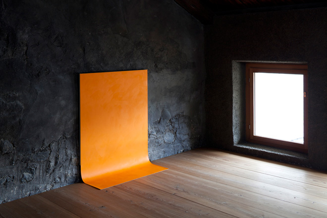 “Martina Klein, born in 1962 in Trier (DE), makes large monochrome canvases, which are most of the time not hanging on the wall in an usual way, but stand against the wall or stand free in space, like an object. According to Klein the composition is not made in the painting it self but occurs in the space, within the relation of other paintings. The various monochromes make a choreography of color planes which defines the space and gives it character.