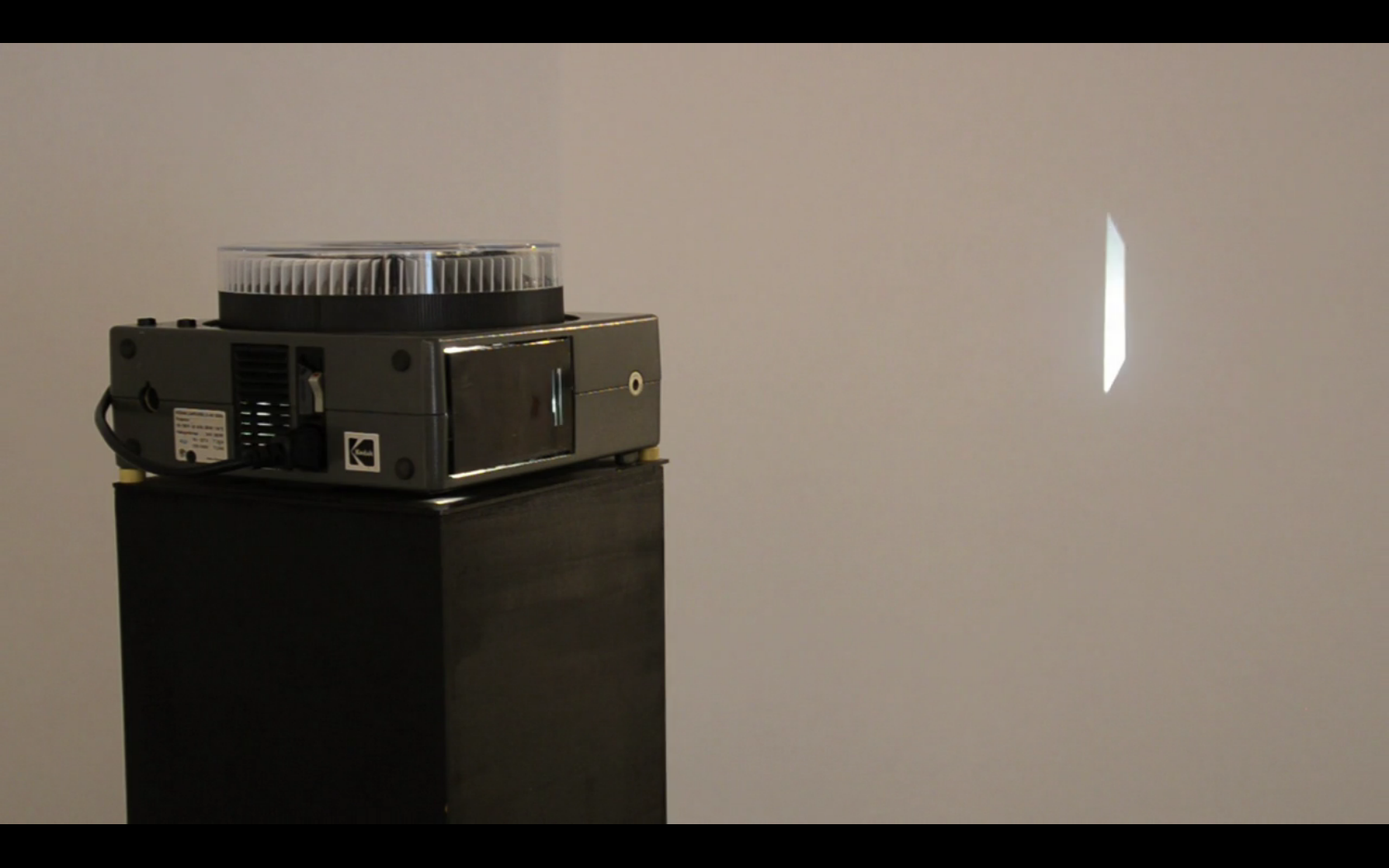 “ROTATE is a plane rotating on itself at the same speed as the carousel which projects the plane: there is a parallel time. Installation designs light through a plane, a frame of white light showing a blank space behind the projection plane. As the plane rotates on itself and blank space is beyond (behind), this space is also around the plane: there is a parallel space. Time and space coincide with reality.