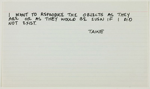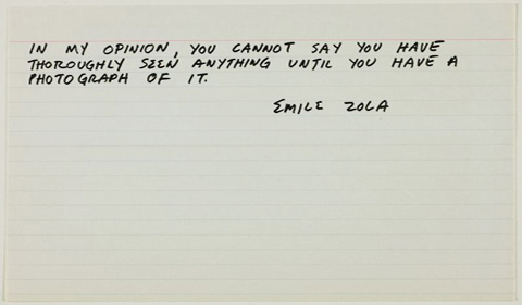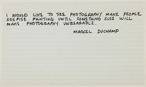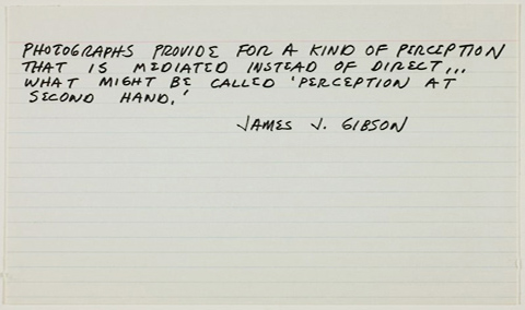 …I submitted it to Artforum but Philip Leader said ‘we’re not a goddamn photography magazine, this is an art magazine, don’t give me anything on photography, we don’t do photography!’ Then I sent it toArt in America and they were not interested either, but suggested that I send it to a photography magazine! Like Popular Photography! Well I knew that no photography magazine could possibly be interested in this, so I put it in a drawer and forgot about it. Then in 1970, Marian Goodman, who then had a gallery called Multiples Gallery, came up with the idea of doing a boxed multiple set of artists’ photographs. She made this box which was quite an amazing thing, it had Smithson, Graham, Ruscha, Dibbets, Rauschenberg, LeWitt, myself and a number of other artists. My contribution was a version ofDead Ends and Vicious Circles, a compilation of quotations I titled “Misunderstandings( A Theory of Photography).” And to further add to the confusion, three of the quotes were fakes, I made them up. The last card in the envelope is a reproduction of a negative of a Polaroid, but of course Polaroids don’t have negatives!”” – interview excerot with Hans Ulrich Obrist.