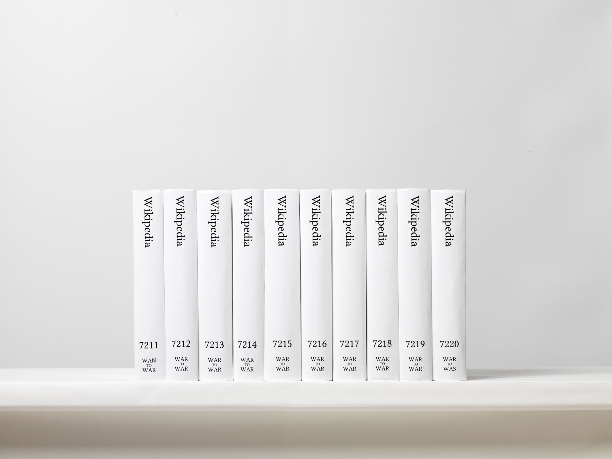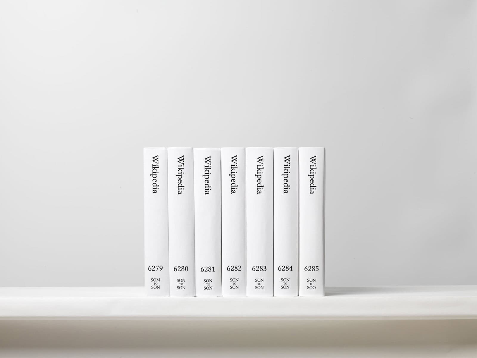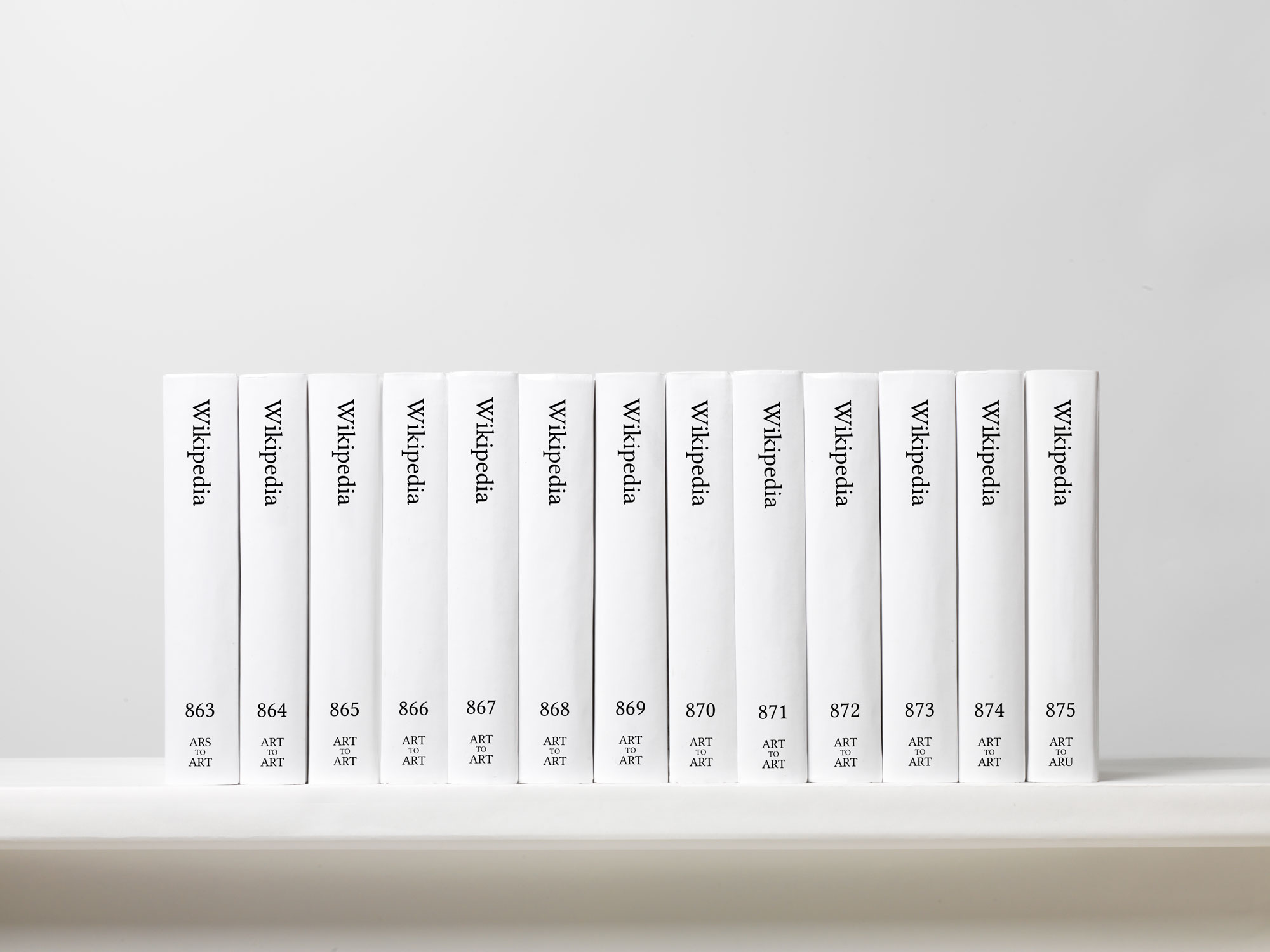 The upload page at Lulu.com will be projected onto one wall of the gallery, which will remain open around the clock through the weekend and then for more regular hours until the upload finishes roughly two weeks later. For the code-literate, the technical operations will be tracked on a monitor in the gallery and online at printwikipedia.com. For the print-minded, the gallery’s other walls will be lined with wallpaper showing the spines of the first 1,980 volumes in the set, supplemented by 106 actual physical volumes, each of which runs to 700 pages.