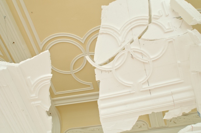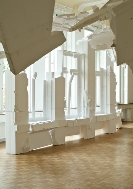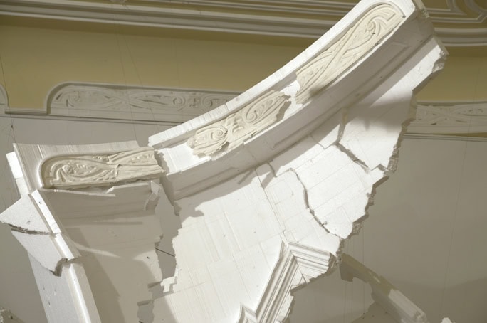 The explosion itself cannot be seen but only its effects. The instant of the explosion constitutes an annihilated fraction of time as well as the disintegration of that space in its previous form. The frozen mass of ruins represents an image of the incident, it reflects the energy of the explosion. In that sense the ruin of the hall conveys the idea.” – Min Jeong Seo