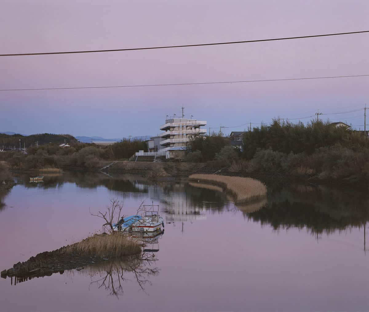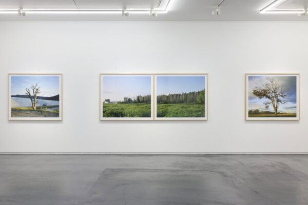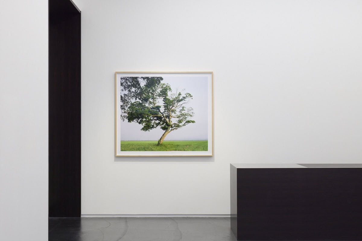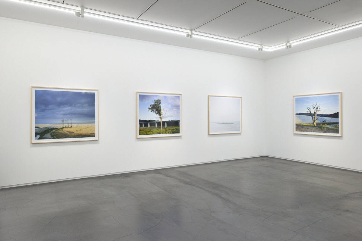 “Tsunami Trees, which Hatakeyama has been working on since 2018 and has culminated in a photobook in 2024, is a group of works documenting the trees and landscapes left behind on the Pacific coast that retain the traces of the tsunami. In 2017, six years after the Great East Japan Earthquake, Hatakeyama came across a walnut tree on a riverbank upstream from the Kesen River, which flows through his hometown of Rikuzentakata. The tree, which Hatakeyama calls ‘half a tree’, has abundant foliage on its left half, but the trunk of the right half was damaged by the objects from the Tsunami, preventing water and nutrients from reaching the dead branches. Driven by the urge to find similar trees, Hatakeyama traveled around the Tohoku region with the help of his acquaintances, and when he came across trees that had been affected by the disaster in various ways, he recorded them with his large format camera. The Tsunami Trees captured in the photographs bring us back to our awareness of the relationship between trees and people; at times the trees are revered as a steadfast presence, and at other times they are inconsiderately cut down and used. The newly constructed seawalls and highways around the freestanding trees also provide a glimpse of the time that has passed since the disaster, evoking our individual memories.” – Taka Ishii Gallery