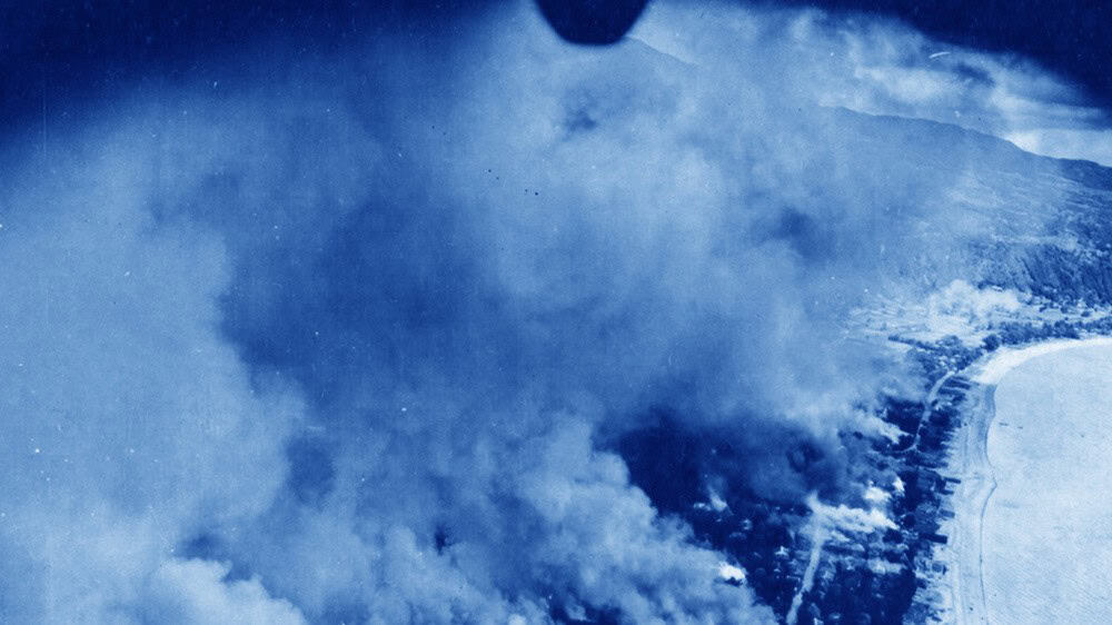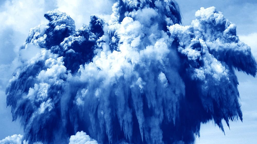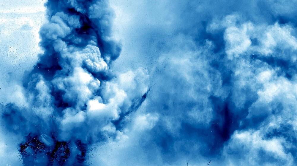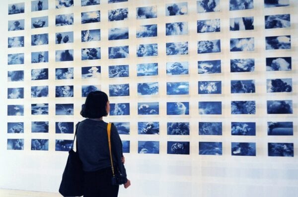 “Almost 200 small masses of Sanctified Clouds fly over the wall, foam beautifully and shine in a blue hue, the blue of peace, Oriental ceramics, and sacred mosaic paintings in Arabic temples. However, looking closely, we realize that these soft white are not clouds, but actually the masses of dust and smoke bursting all around. Nguyen Phuong Linh collected images of bomb explosions, initially in the Vietnam War, and then gradually expanded to other conflict areas in the Middle East. To emphasize further the insensitive violence of bombing, Phuong Linh cut off the entire context of the photos, leaving only smoke and dust swirling in midair.” – Nguyen Art Foundation