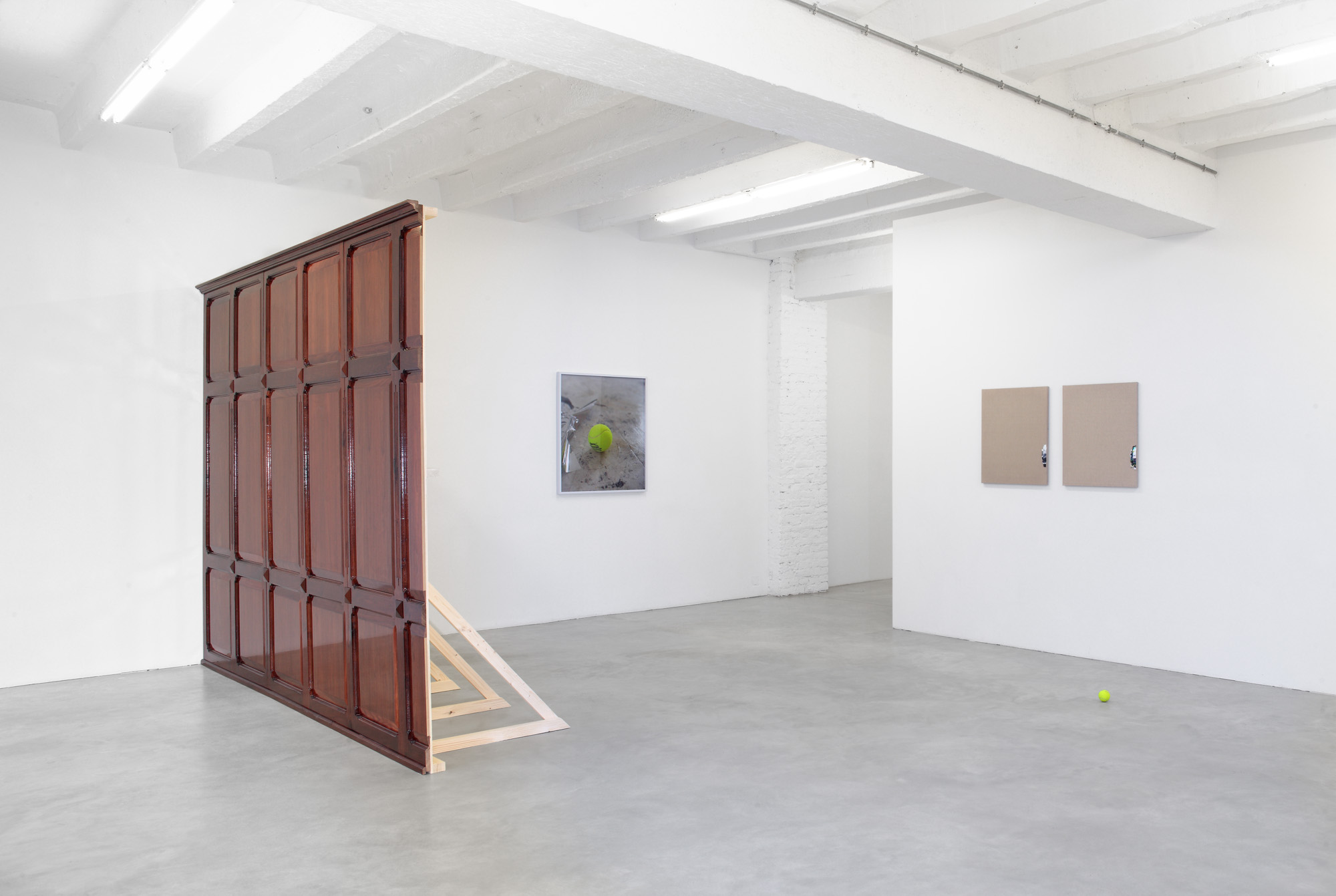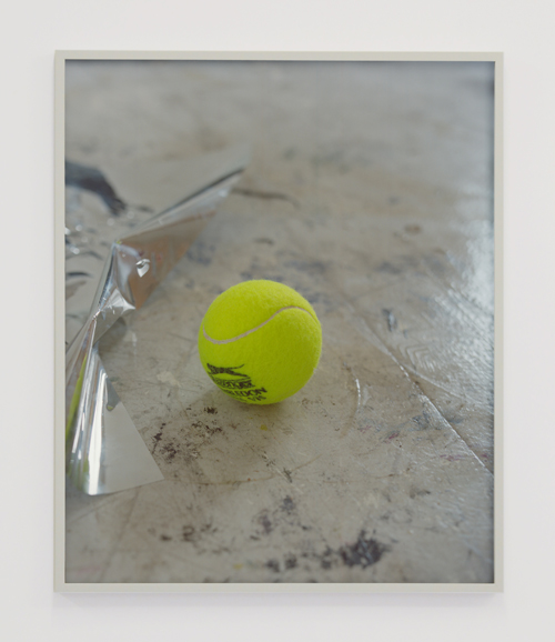 Tinted glass, metallic foil, dark wooden boards, a furry tennis ball. Familiar features from storefronts, lowriders, executive offices and clay courts. These works are extractions, rather than abstractions – a variety of veils and windows from the corporate skin of our contemporary cities. Appearances can be deceptive: The transparent surface of an institutional building does not guarantee a similar transparency in its affairs. In Lund Bø´s works, the monochrome surfaces are considered for their concrete material qualities as well as external connotations, short circuiting the idea of a self referential abstraction. A massive mahogany wall and a ruffled metallic foil both suggest clandestine activities; be it financial or sexual. These monochrome surfaces are stage sets, codes and catalysts, producing their own specific rules of engagement. Materials inscribed with meaning, radiating power and desire. There is a sleazy aura to these material arrangements; cheap goods borrowing the shine of a more exclusive relative. Or visa versa. The assemblages have flawless, unspoiled quality in contrast to the rifts and scratches apparent in the photographic works. Like clocks, they impose a timescale on their surroundings. The patina of a grey vinyl floor becomes a relief; a superficial archeological index of human activities with a bright yellow tennis ball as an unpredictable punctum.” – Jan Freuchen