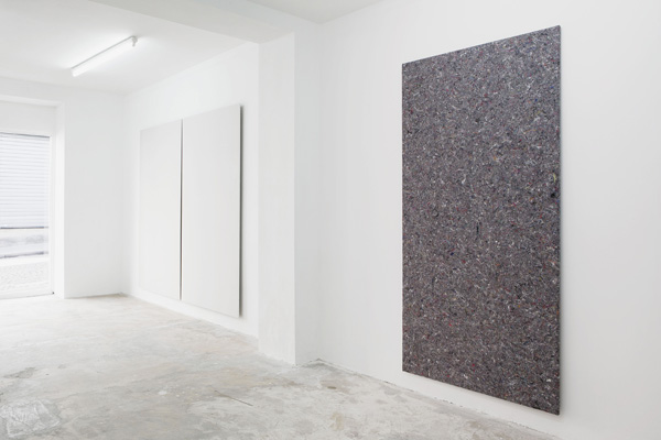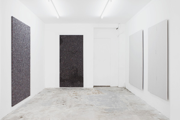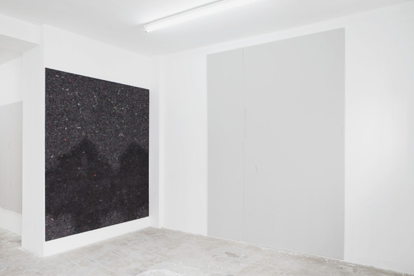These standardised measurements function as a structural premise that contextualises the works in the exhibition and ties them to another. This is not only evident, however, in their formatting, but further in the materials employed by Sande for their realisation. The unpainted plasterboards are put into a direct relationship with paint-absorbent felt, entering the two into a mutual relationship characterised by the potential of spills. This becomes a clearly felt tension between the repellant and the absorbent; a tension that is highly emblematic of the spatial parameters Sande delineates in his practice. Each space becomes a space of dialogue between the materials and structures that form its existence, and by extension, inform our experiences within their con fines.
