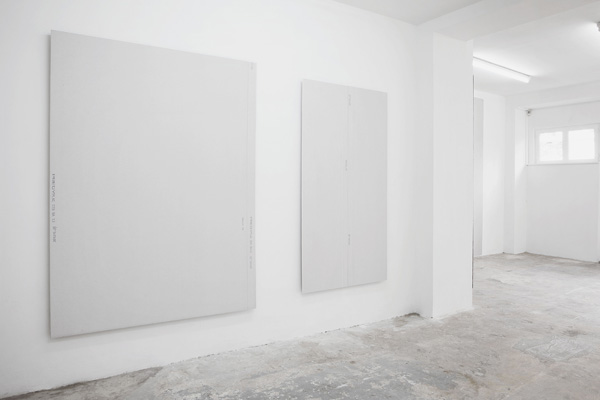 At that, there is an implicit poetry that lingers around the works, evoked in the elusive nature of the titles. As a viewer, one is made to wonder where the rigid measurements and architectural material vocabulary comes into relation with the sentimentality and enigmatical nature of the notes. They seem to hover on the sidelines, informing the work, almost distracting from its stark flatness. The titles and dimensions of the works, provided by Sværen through a series of exchanges with Sande, could be described as marginal notes; they become exposed as the internal commentary of the poet, responding in quiet, significant gestures to the experience of the Suites.” – Galerie Antione Levi