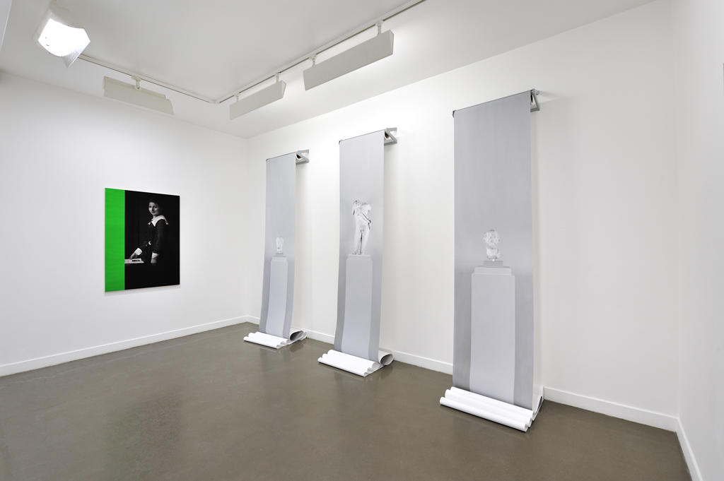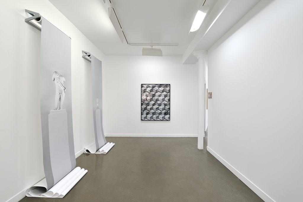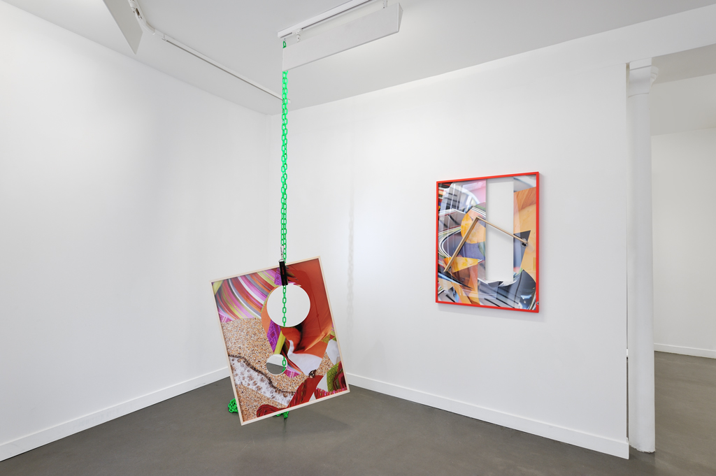 To afford “the humble servant of the arts” (and of many other things besides) to finally stand for itself, there was only a short step. Artists of the exhibition “One Step Beyond” have taken it. From different backgrounds, they have turned their back to the dogma of the indexability, they aknowledge other qualities to a photograph and – even if they sometimes push it around as to better understand its essence -they take it for what it is: a material to work on, an autonomous object that unfolds in space, is freed from its frame and offers a surface with depth. Therefore, if Hannah Whitaker still works with film photography, she establishes a critical distance towards the represented object by placing hand-cut paper screens in front of the film at the shooting stage. The photograph made through this method seems to acquire a third dimension which disrupts our perception and makes us aware that any image capture results from a more or less elaborate device. Jordan Tate seems to operate with the same type of reversal since his works tend to point to the processes involved in the workflow that makes them emerge: exploring different aspects of the “making of” a digitally reworked photograph , he highlights what does not usually appear. In his photographic installation New Work # 169, the image becomes a sculpture – a tautological one, furthermore – but preserves its integrity as it keeps its materiality, that of lightweight paper. This shift to a spatiality of the image is also at work by other artists such as Letha Wilson whose photographs of American landscapes are transformed into a material she recasts, kneads, experiences to create meaning. Similarly, pieces of Constance Nouvel, Décor XIII and Persistants, silver prints on plaster, seem to defy different spaces, those of reality, of the pictorial representation, of the three-dimensional support in which the image is inserted in a dialectic and poetical manner. Away from this elegant simplicity, Kate Steciw ‘s pieces appear at first sight more complex, not to say crazy! The artist works with commercial photographs from image banks and online shopping sites that she collects using the metadata tags. These images are then fragmented, distorted by softwares, and then cut again and gathered in large abstract compositions close to collage or painting. Nothing breaks through these buryings of crushed photographs accompanied by their keywords, except shapes, textures and vibrant colors, attractive and trivial, as if the artist had striven, by digital alchemy, to extract the pith and substance of advertising imagery. Finally, the German Christiane Seiffert adopts a very different approach, off the wall and closer to performance: she photographs herself “like a postcard ” becoming either a cityscape, an armchair, an orchid or an electrical outlet, suggesting that it is not the image but the body of the artist that bears the mimetic function of photography. By this absurd shift and the choice of “trash” aesthetic close to amateurism, she’s teasing the “beautiful picture” and the ability of photography to be faithful to reality. No, it’s not a representation of reality that the artists gathered in this exhibition invite us to look at, but it is photography itself; “Hey you, don’t watch that, watch this! ” they seem to say, as in the injunction that opens the famous – though a little forgotten – piece of the “Madness” group, One Step Beyond.” – Isabelle Le Minh