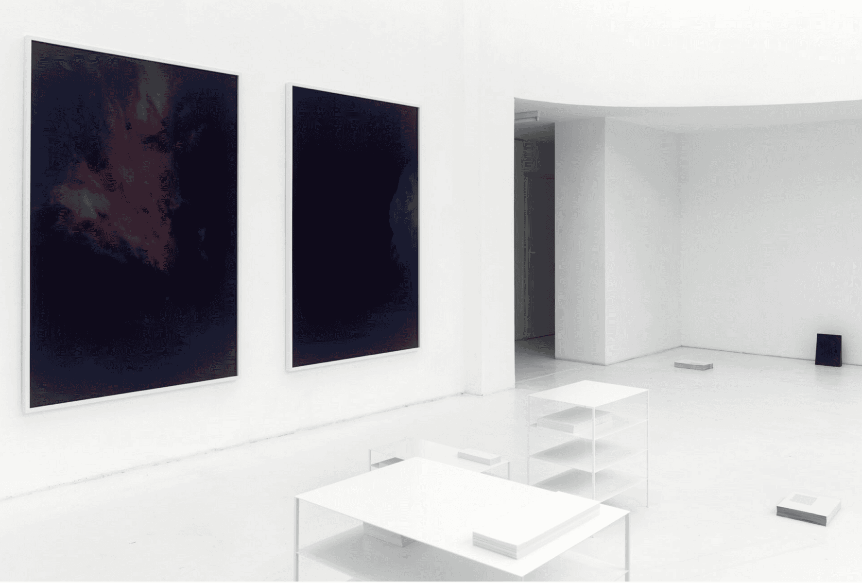 Observing the subjective perception of time and its interweaving with memory is a recurring theme linking the artist’s works presented in this exhibition. As a factual system of order, his works refer beyond their material being to something that can rather be felt than seen. In Landscapes (2017), he shows a series of shelves housing book objects. On the first pages of the books, landscapes, certain locations and environments are described in brief texts. The following pages are left blank. Using minimal means, sentence after sentence, layer after layer, landscape scenes are revealed, while the blank pages lend the evoked images an expanded spatial dimensionality. The series Dust (2017) consists of table objects that contain piles of paper made of marble dust from Carrara. The materiality of marble appears here in its smallest, most fleeting particles and merges with the flexibility of a sheet of paper. The immaterial white and the geometric reduction amplifies the impression of the sculptures being physical forms of a moving conceptual space, between the memory of mountains, the quarries in Carrara and the human desire to record what has been experienced. An underlying tension emerges in the photograph Todtnauberg (2018), for which the artist visited the village in the Black Forest where Martin Heidegger once wrote his main work Being and Time (1927). Hardly identifiable as an actual location in the flurry of snow, the image of his hut attests to the inconsistency and diffuseness of philosophical interpretations.