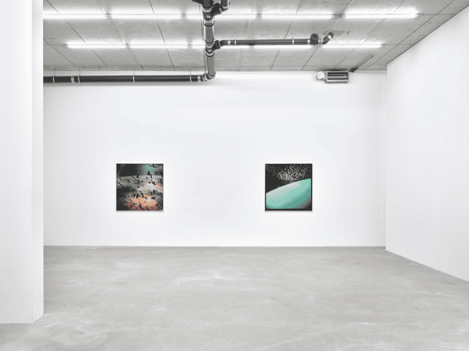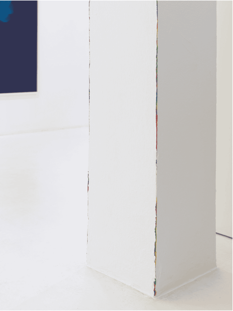 In another way, the work Rainbow (2016/2018) undertakes a material intervention in the concrete architecture of the gallery. Following the artist’s instructions, the three bearing columns of the space were painted in nine different colors in a certain order, one color after another. The last layer was set as a white RAL, so that the changes are only recognizable in the traces of paint on the edges and corners.