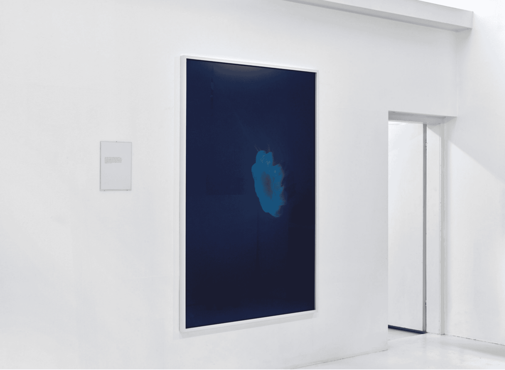 In Eleven Works Daniel Gustav Cramer presents the spatial constellation of his works between various fixed points that link distant geographies, their landscapes and direct contacts with their residents. One of the starting points is a series of four photographs, Eyjafjörður (2018), which show various colorings and transparencies on deep blue. Their location is explained by a brief text that describes how the original film negatives have been taken by a man who lives in Iceland. During his trips onto the fjord, for several years he shot underwater photographs, and archived their resulting negatives and contact sheets. With these images, the man unconsciously mapped the space between the two shores of the fjord, with his childhood home on the one side and his current place of residence on the other. Daniel Gustav Cramer’s display and their contextualization unfolds a structure of memory that goes beyond the visible water formations. As frozen moments, the photographs attest to the crossing of actual distances by the small boat drifting across the fjord as well as the intersection of past and present.