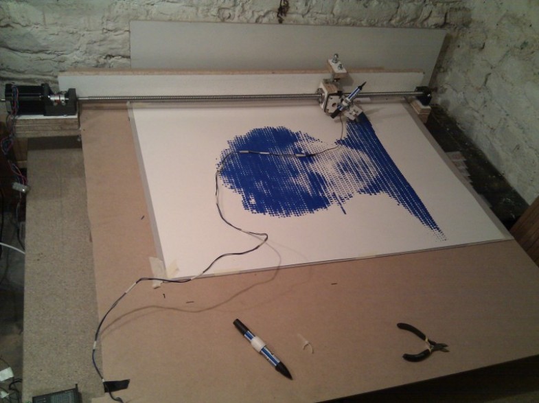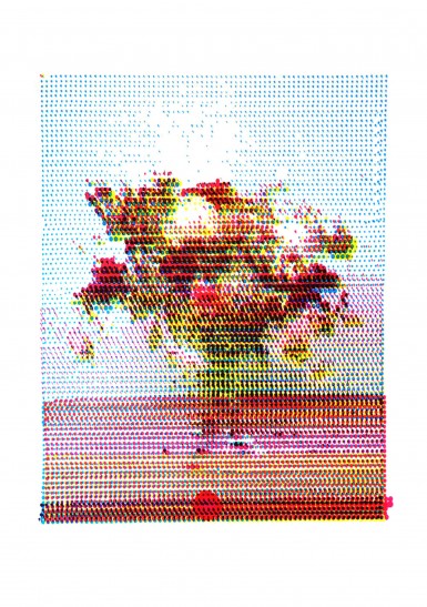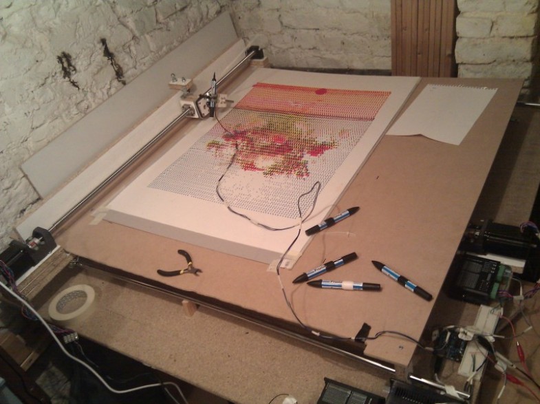 “DIY printing system using felt pen on blotting paper.This machine functions in a similar way to a CNC machine, with an incorporated program to print any image using a time-based algorithm. According to the grey value of a pixel on an image, the felt pen remains in contact with the blotting paper for relative periods of time. Consequently the ink will bleed through the paper creating a variety of different sized stains, gradually building the image. It can takes around 34 hours to print one colour image. The slow printing process and the imperfections we obtain every time is what makes every print unique.” – Paul Ferragut