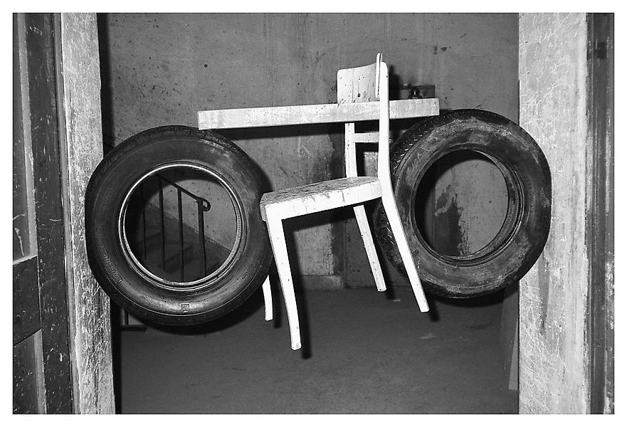 “The Equilibres photographs are images of household objects and studio detritus arranged to form tenuously-balanced assemblages, and it is from this moment of passing equilibrium that the series takes its name. The group includes both color and black & white photographs and takes as its subtitle the phrase, “Balance is most beautiful just before it collapses.” To this end, the emphasis in these works is on the beautiful, playful, transitory arrangement of the objects in space, where chairs and brooms, cheesegraters and wine bottles are choreographed into moments of delicate suspension. The assemblages do not simply look temporary; once photographed, they were disassembled, and today these photographs are the only record of their existence.