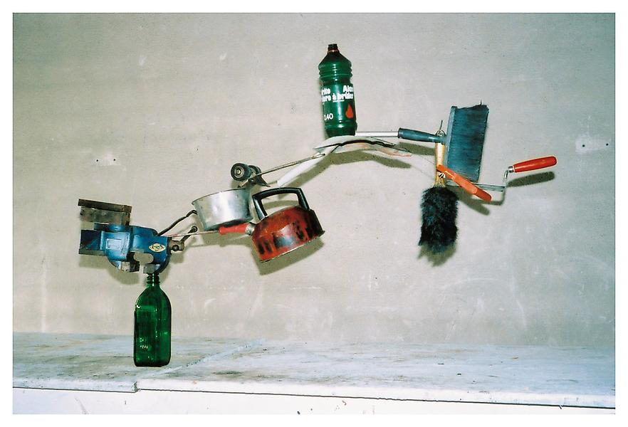 Though the sculptures varied significantly in size, the Equilibresphotographs set aside the issue of scale: each assemblage appears nearly the same size on the sheet as any other, regardless of the materials used. In addition, Fischli and Weiss gave each work a poetic, often ironic title based on its appearance: a vertical assemblage involving a bottle, a carrot, and a spatula, all held together by a piece of cord, is called The Roped Mountaineers; a bottle and metal vice form the base of an almost impossibly cantilevered construction, with a tea kettle, a trowel, and a feather duster reaching end-to-end out into space, in As Far As It Goes.