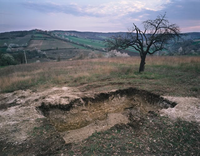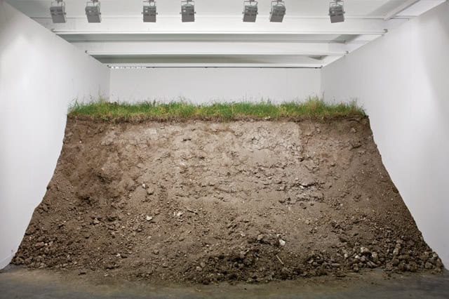 “Kostërrc (CH), 2011 consists of a hole (600 x 400 x 230 cm high) made in the Kostërrc hill in Kosovo. This hill is property of the Halilaj family and the original location of the house where the artist was born. The soil taken from the hole is transported to Basel, to nearly fill the booth at the fair. This “land for sale” relates both to many personal and intimate questions which are integral to the artist’s research, as well as to social and cultural problematics linked to the newborn state of Kosovo and its migration phenomena (with a particular relation to Switzerland).