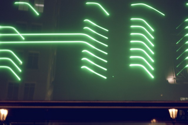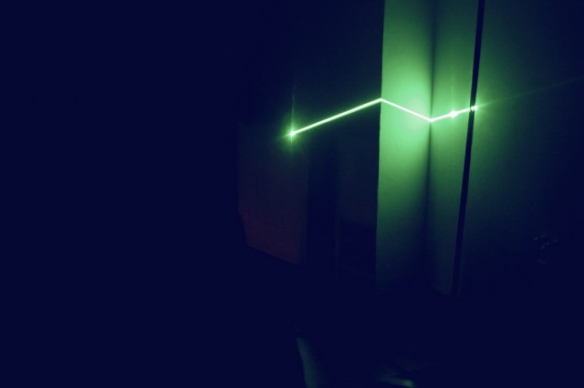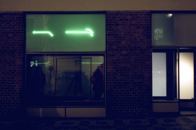 In this site specific installation a second room is superimposed on the 22PRESENTS showroom. The skeleton of the space is shifted into a different perspective and outlined on the walls. Focussing on the transformation of one perspective into the other the space between the two is explored through iterative processes. The infinite variations and states of the process are reflected in generative laser drawings. The sound creates a constantly changing environment. Space is made perceivable through moving relatively static sound sources across a special loudspeaker setup. Different sound beams scan the room and explore its spatial properties.” – 22Presents