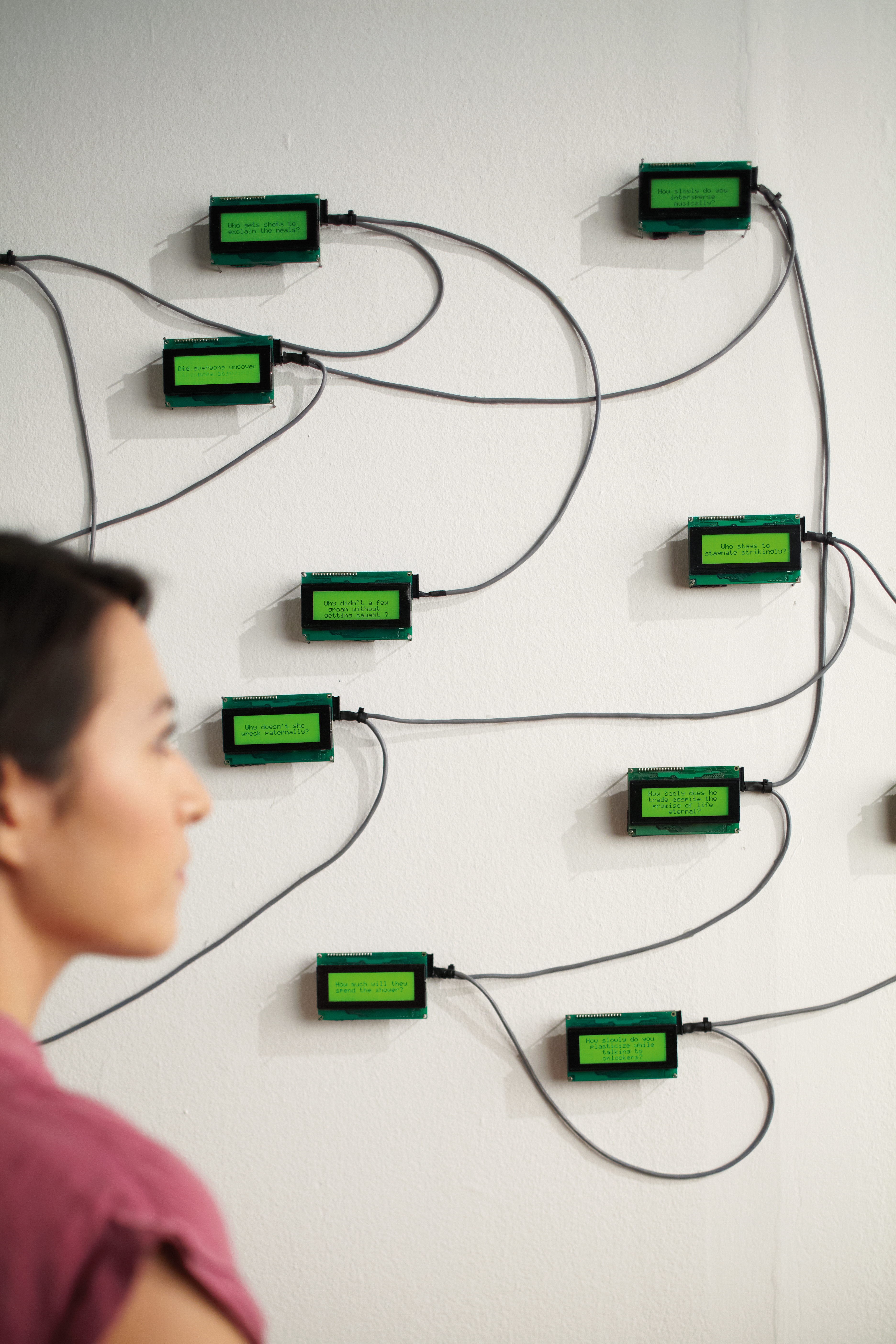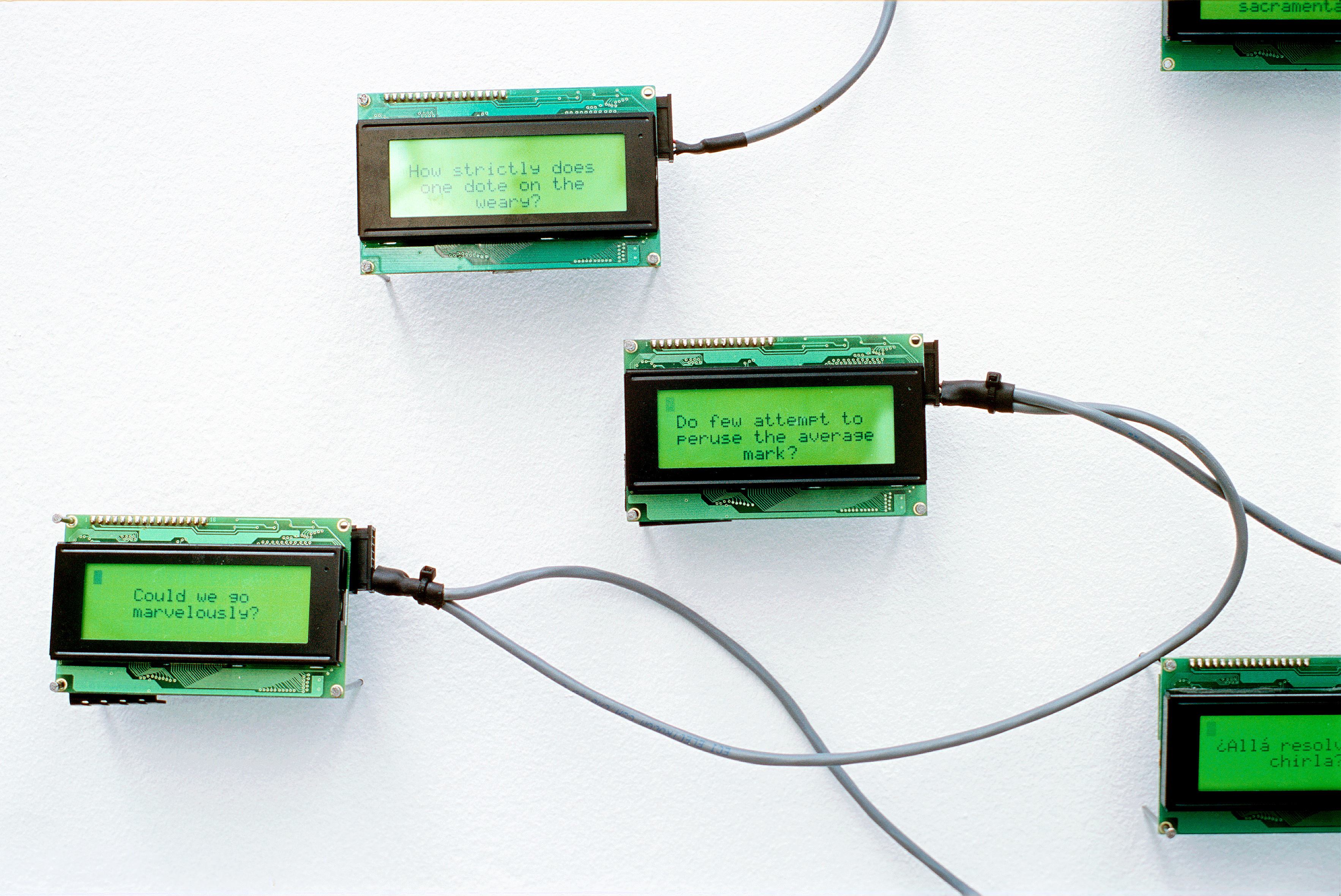 “33 Questions Per Minute consists of a computer program which uses grammatical rules to combine words from a dictionary and generate 55 billion unique, fortuitous questions. The automated questions are presented at a rate of 33 per minute –the threshold of legibility– on 21 tiny LCD screens encrusted on the support columns of the exhibition hall or mounted on a wall. The system will take over 3,000 years to ask all possible questions. By means of a keyboard, members of the public can introduce any question or comment into the flow of automatic questions. Their participation shows up on the screens immediately and is registered by the program.” – Rafael Lozano-Hemmer