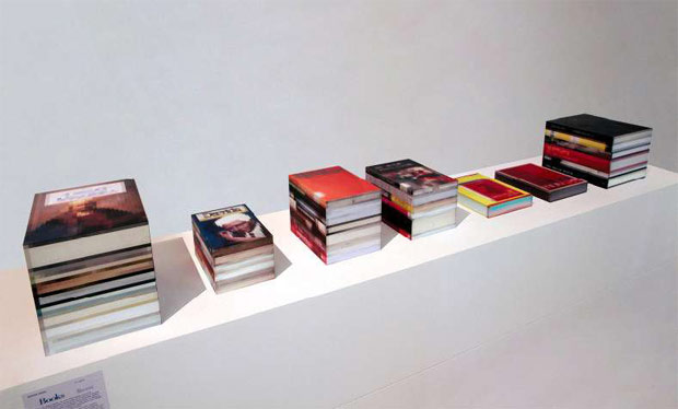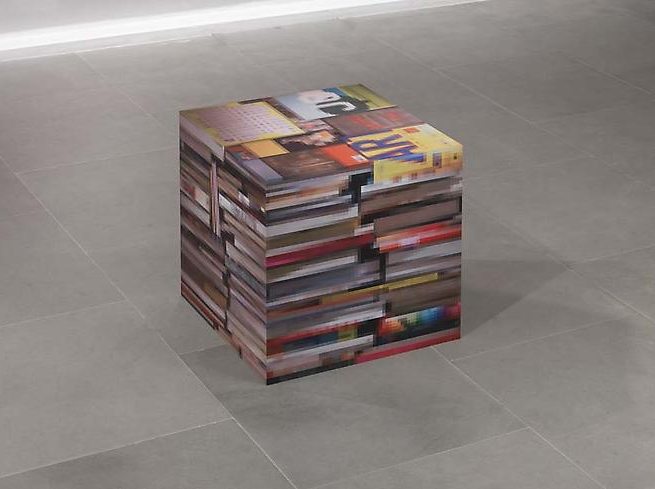 The photographic sculpture, Books (2010, UV Inkjet print on aluminium), features images of books layered on blocks that themselves resemble books. The work both maps and manipulates the distance between idea and object, representation and reality. Here Rana challenges our understanding of three-dimensional forms through the use of pixelated imagery, pixelation being more commonly associated with two-dimensionality.