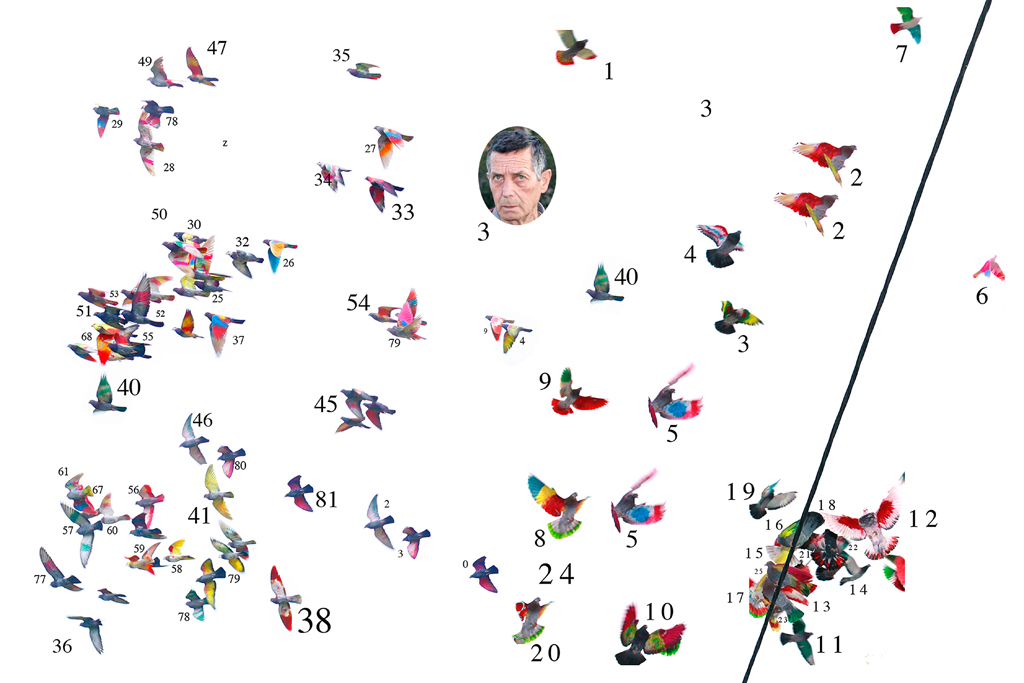 The present series examines the game as a symbolic act, a projection and a way of relating to the world. A group of men running through the countryside behind their male pigeons, observing their mating performances, discussing the rules and arbitrations⦠It refers to the ethnographic documentation of remote tribes rituals or to the group of children who invent a game while discovering the world.” –