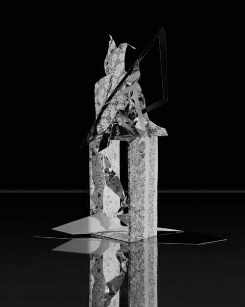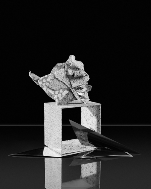 “In the series Three Sisters, Perez has titled each work after a ship on Columbus’ maiden voyage to the Americas. The studio constructions in these three photos are comprised of floral-patterned fabrics, reflective foils, plastics — reworkings of inexpensive, mass-produced goods that likely made their own voyage to the Americas, but across the Pacific. Photographed in black-and-white, these works provide a sublime contrast to their more ostentatious B.O.G.O. Vision companions. Moreover, Perez’s intent here feels darker, more bitingly sardonic and less ludic. Naming these works after the ships whose voyage was the harbinger of global trade (and exploitation) to come, may thus strike the viewer as a — perhaps morbid but no doubt relevant — joke, which also signals the fact that this New World in question is now clearly making way for the next one.” – Yautepec Gallery