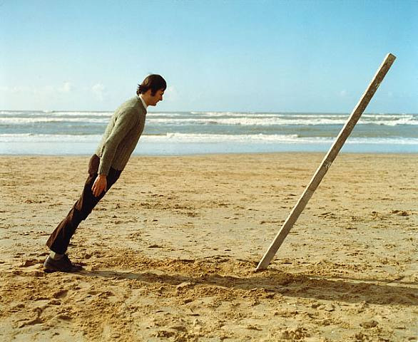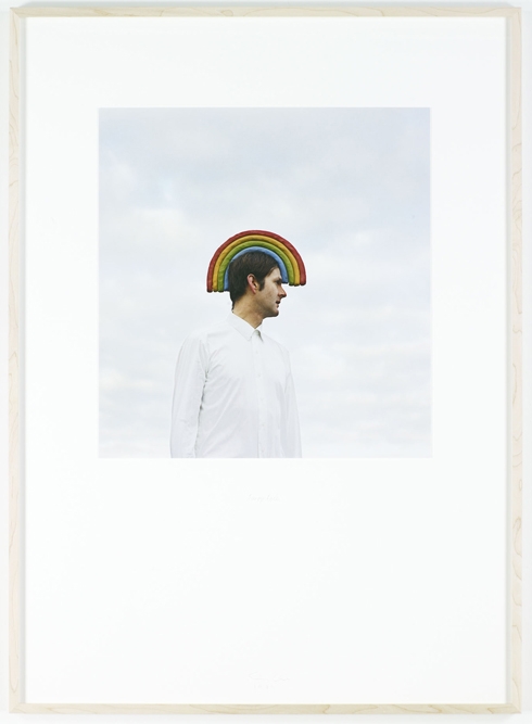 “These photographs, influenced by Fluxus and conceptual art, and collectively titled Situations, construct a certain poetic and philosophical vision through a series of staged situations where the artist himself is a stand-in for a persona caught in different circumstances. Each mise-en-scène frames human existence in a humorous and pointed way, confronting the balance between nature and culture. Gudmundsson juxtaposes his meditations on existential questions, such as D’où venons-nous? Que sommes-nous? Où allons-nous? (Where do we come from? Who are we? Where are we going?), with an imaginative interpretation of the environment and elements of fantasy. At the same time, he positions human beings as part of nature, and offers viewers a fresh angle on the interpretation and experience of culture. The artist’s symbolism is drawn from subjects which range from science to fairytales, though his main source is daily life. Unlike some of the dry conceptual art of the seventies, Gudmundsson’s work is a dynamic meeting of lyricism, humor, and melancholia.” – text via i8