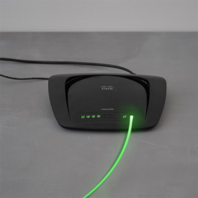 “Network Time is an internet based unit system created by Spiros Hadjidjanos late 2011, it consists of several Wi-Fi routers arranged in the gallery space providing free Internet access to visitors. The LED that reflects the data-traffic of each router is extended along a fiber optic cable magnifying its flicker. Although the devices look only physically modified, the artist has altered the operating system of each router, to manipulate the fluctuation of the fiber optics.” –Kwadrat