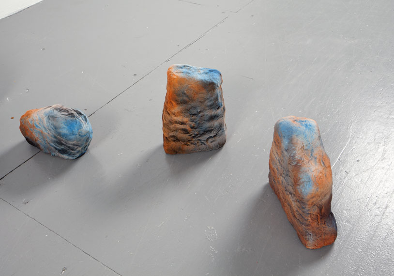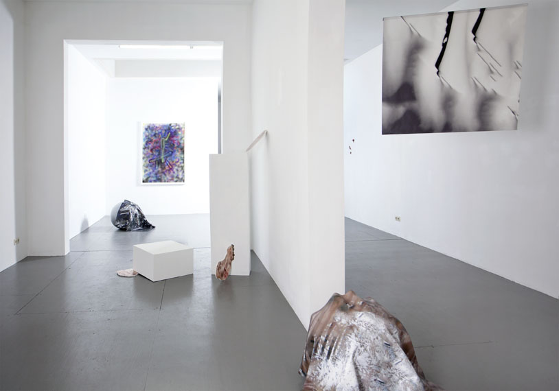 In Katharina Fengler’s paintings flatness dominates. On her large airbrushed works on paper fore- and background merge, while high and low contrast meet. Her paintings have an absolute presence, no before and after. The eye doesn’t know where to focus, how to zoom in or out, where to look first. Her paintings conjure the atemporality of the screen, the juxtaposition of disparate entities on one equalizing plane. This obstruction of perspective, in combination with a mesmerizing presence, also translates to her sculptural work. As if they fell from the paintings, these objects occupy space like alien things. Upon closer inspection, they reveal distinctly human marks, such as handprints, which complicate their smooth, Photoshop-like appeal.