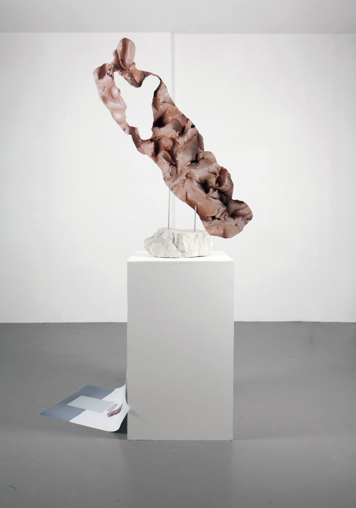 Rachel de Joode’s sculptures often play with expectations connected to specific materials and surfaces. In her work, digital images are given a material presence in the physical space of the gallery, which they nevertheless have to share with other objects. In the case of “Reclining Wet Clay On Greek Marble,” a high-definition photograph of wet clay is mounted on top of a marble stone as a sculptural element, generating a sense of dissonance that addresses our habituated perception of each medium. For “Folded Skins,” De Joode pasted together images of her skin to create a group of photographic sculptures. These sculptures are informed by the smooth and homogenizing effects of digital image-processing software, while simultaneously highlighting the uneven and porous textures of the human skin. The photo collage is printed on round, bean-shaped cut-outs, which are somewhat oddly grouped together. This further complicates their presence as objects constituted on the bleeding edges of the slick and the granular, the artificial and the organic, surface and depth, the screen and the gallery space.” – Boetzelaer|Nispen