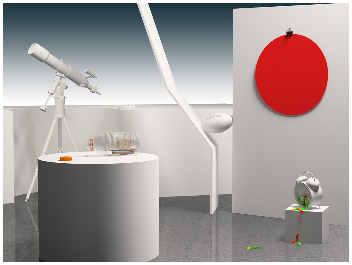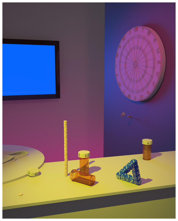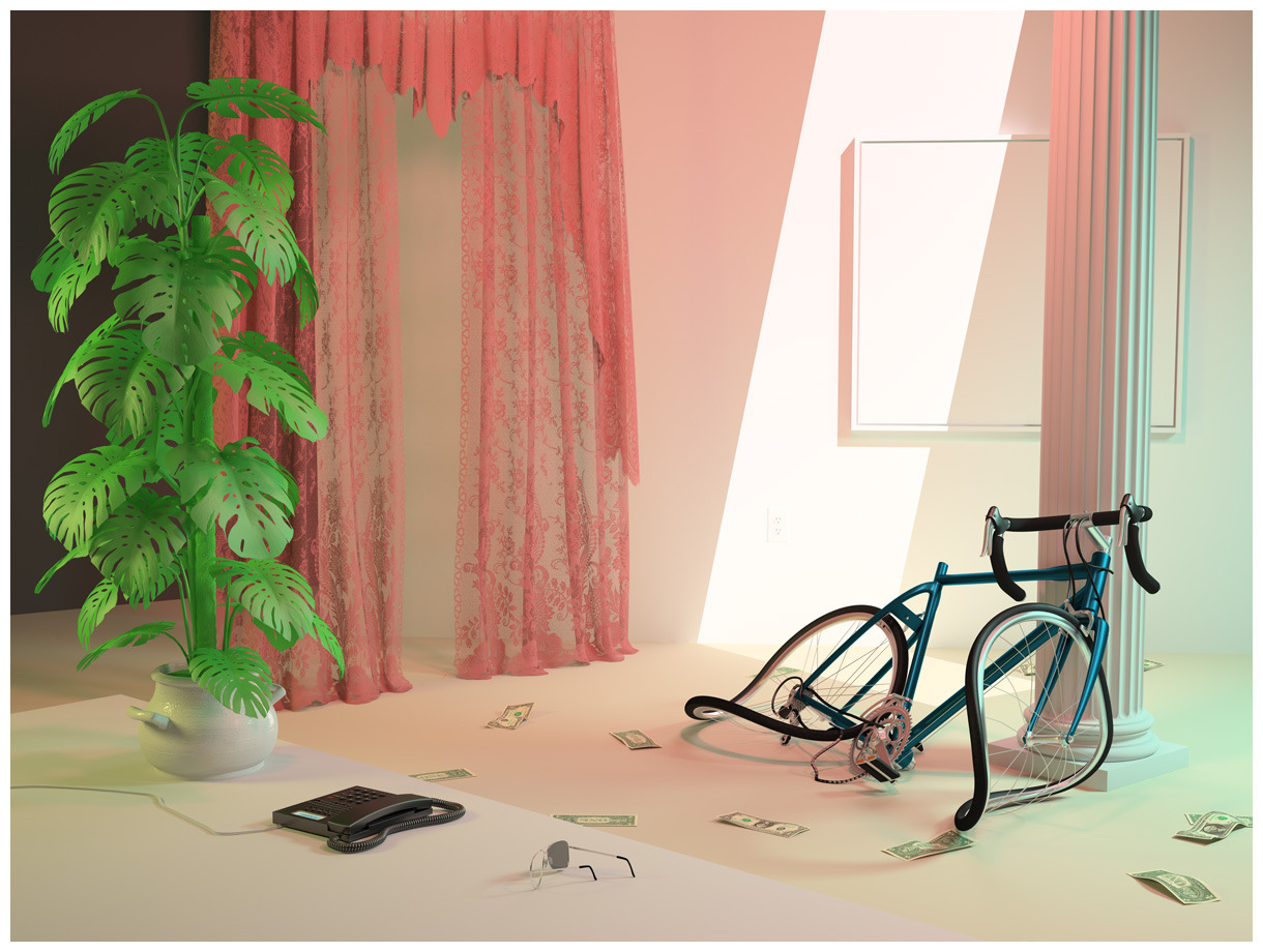 “His images display the technological innovations that invade our 21st century lives: sports drinks, antidepressants, Apple products, brand- name snacks, and exercise equipment. The objects have either been immaculately sculpted through computer programs or purchased as ready-mades from 3D web malls. Without access to a Hollywood animation studio, Murata relies on a shared knowledge from the online community including YouTube tutorials. Using the Open Source model of production, Murata creates digital pictorial spaces hovering between waking life and the dream world, i.e. conceptual photography and surrealism. The product of Murata’s trademark DIY high tech vocabulary, these contemporary still lives conjure at once Pixar’s Toy Story, Salvador Dali’s The Persistence of Memory, and the online 3D game Phosphor Beta 2.