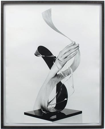 What particularly intrigued me about this group of images was how that network of signals was not confined to formal relationships between the objects depicted in the images. There appeared to be a subtle semiotic layering occurring; allusions to art history but also commercial photography. Chetrit’s images speak to the history of still life, and also the objectified representation of women within the avant-garde moment of early 20th-century Surrealist photography (the ghost of Man Ray is clearly present, especially in Nude/Grid, as is László Moholy-Nagy in Chetrit’s approach to photographing objects). Looking at the high-contrast printing, and the way they’re presented in simple metal frames, I also couldn’t get away from thinking about how tasteful they look. And just as you arrive at that word – tasteful – that’s when Chetrit’s work reveals further levels; the high-contrast prints, the female hands and the mute, enigmatic compositions (in particular, the hands holding sculptures) remind me strongly of fashion photography, or of 1980s Athena posters – black and white, hard-edged, cool yet mysterious. These are still lifes of both objects and styles, vanguard Modernism and high-end perfume ad all rolled into one. Chetrit’s photographic still life studies intersect with historical allusion and commentary on how photography’s stylistic codes get absorbed into a mainstream of visual representation. Did I say something about these being simple?” – Dan Fox for Frieze.