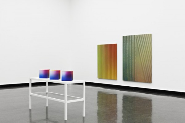 The title of the exhibition plays on the notion of ‘tetrachromatic’ vision. People normally perceive the world around them trichromatically (in three colours). Humans have three types of receptor for the perception of colour with varying sensitivities: red, green and blue. A new theory exists that there may be a small percentage of people (only women) who have a fourth colour receptor, which makes them ‘tetrachromatic’. In order to play on such ideas of a fourth component which, if it could be proven, would radically change our view of the world, Auerbach employs two analogies in this exhibition – the spatial (the idea of a fourth dimension) and the spectral (a fourth colour spectrum).