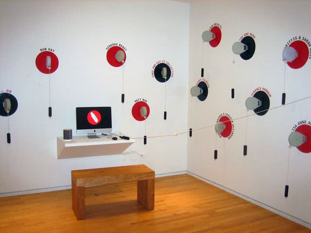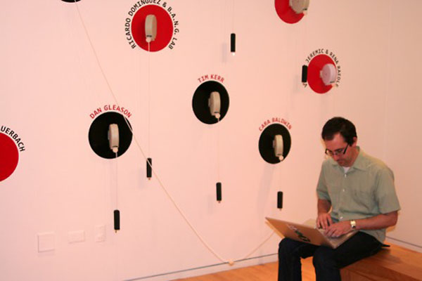 “For Designated Drivers, we invited an international selection of twenty people and groups to each fill one four-gigabyte USB flash drive with material of their choosing. These drives will then be presented in exhibition spaces, attached to wall-mounted retractable laundry lines. Visitors will be able to load their own drives or laptops (or use a host computer and CDrs or DVDrs) with any of the material they would like from each of the flash drives.
