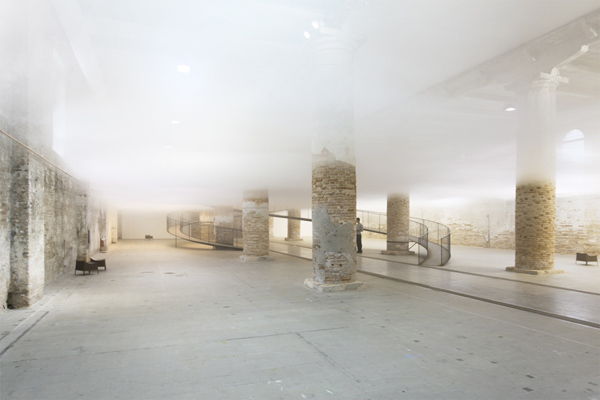 TRANSSOLAR & Tetsuo Kondo Architects create Cloudscapes where visitors can experience a real cloud from below, within, and above floating in the center of the Arsenale. Visitors find a path that is akin the normal experience of walking through a garden. The path winds throughCloudscapes appearing and disappearing. Sometimes people only see the other people across the cloud while the path is obscured. The structure consists of a 4.3 meter high ramp that allows visitors to sit above the cloud. Simply, the structure leans on the existing Arsenale columns. The cloud is always changing so the experience of the path is also dynamic.