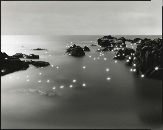 For the process minded, Sato’s works have plenty of technical complexity. Using an 8×10 view camera, he makes long exposures (measured in hours), intermittently moving into the frame with a mirror, aiming vectors of sunlight back at the camera lens; the result are various points of light, made by an invisible photographer.
