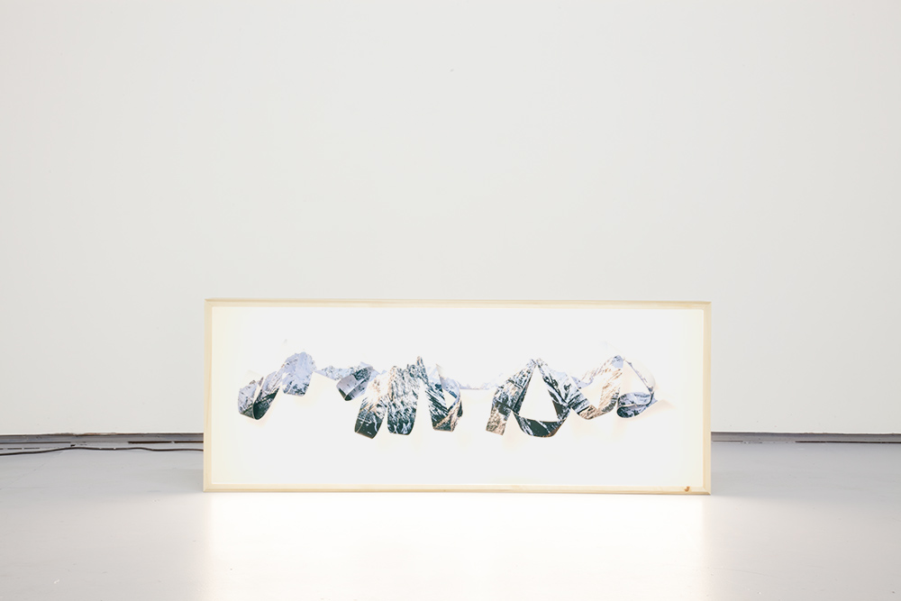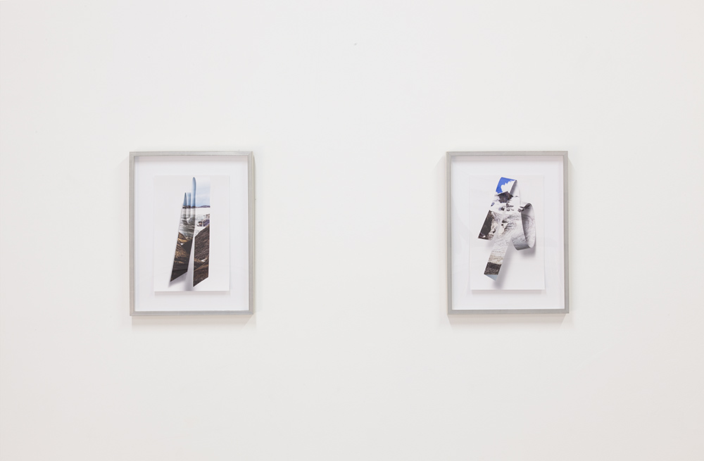 “We, ourselves included is a meditation on landscape photography, representation and inherited assumptions about environments. These works began as typical tourist images taken while visiting Glaciers in-and-around Banff, Jasper, Yoho and Kootenay parks this past summer. The Peyto, Jumbo, Daly and Saskatchewan Glaciers are depicted alongside unnamed ice and snow deposits. These images are printed as long panoramas which are curled and folded in response to the geology of the original photograph. The final folded form is re-photographed in the studio and printed flat.