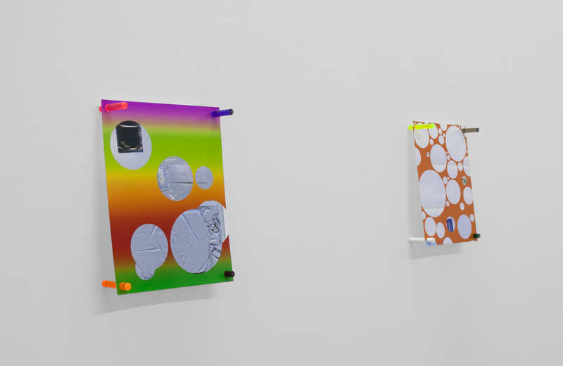 Brad Troemel has made use of the anonymous online black market The Silk Road since 2011. For Vice Versa he scanned and encrypted invoices, packaging, and contraband purchased through the Silk Road using a technique known as ‘bubbling’, a process typically associated with covering online pornography where genitals are left obfuscated by the negative space created from erased circles. Viewers are placed in a position of trusting the limited evidence presented to them in the same manner Troemel relied on images and descriptions when sending anonymous cash over the internet for his purchases. All titled ending in .PSD, an acronym for Photoshop Document, the mounted prints allude to the digital files the prints are made from, whereby the concealed information can be fully accessed.” – Tomorrow