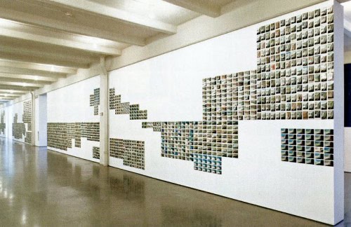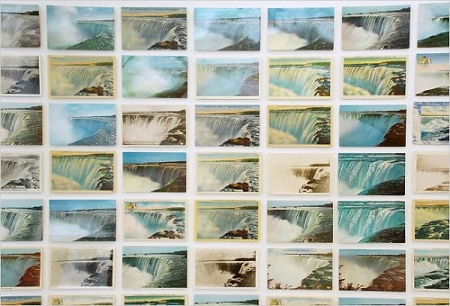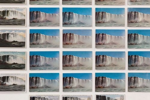 “The cards Leonard has amassed range in date from the early 1900s, when postcards were first allowed by the U.S. Postal Service, to the post-War era, when they had become a ubiquitous part of the American travel experience. Along with other reproductive media, postcards contributed significantly to the transformation of natural sites into tourist destinations. You see I am here after all offers a filter for exploring the ways in which cultural constructions have mapped, shaped, and framed the geography and topography of North America over time. If taken singly, each card may attest to a unique encounter with a particular location at a specific historical moment (as evidenced in the message inscribed on one of them: “You see I am here after all”). En masse, they reflect decades of changing technologies during which the motif of the Falls, shot from a few standard vantage points, was revisioned: hand-colored, over-painted, cropped, or otherwise manipulated in accordance with changing notions of truth and taste. Organized by viewpoint and installed in grids, the ensemble unfolds like a Chinese scroll with one renowned vista succeeded by another.” – Dia Art foundation via pietmondriaan
